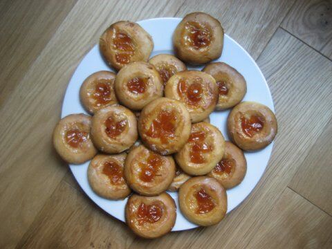 Con el último frasco de mermelada de cerezas sin carozo del pasado año. Galletas sin mantequilla ni huevos.