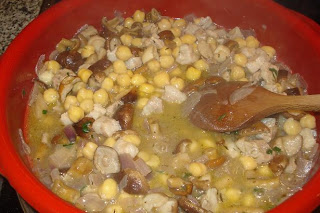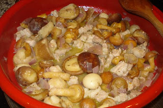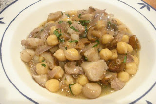 1/2 tarro de garbanzos cocidos, 100 gr. de panceta fresca, 200 gr. de setas mixtas, 1 cebolla roja, guindilla, romero, perejil, harina, vino blanco, aceite, sal, pimienta.