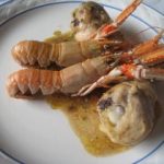 En en la mitad del melon, vaciado y limpio, se pone el gazpacho, las bolitas de melon.. y las cigalas templadas, ( la crema de gazpàcho ha de estar muy fria)