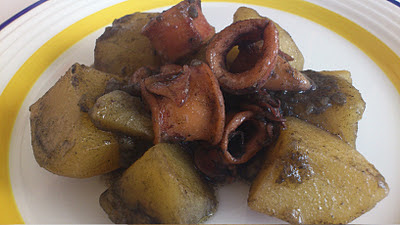 Pelamos las patatas y las troceamos, añadiéndolas al guiso junto con la tinta de calamar, remover e incorporar agua hasta casi cubrir las patatas. Al empezar a hervir añadirle la sal. Dejar a fuego lento de 20 a 30 minutos, cuando las patatas ya estén hechas. Removiendo de vez en cuando.