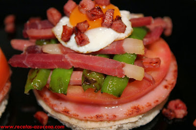 Cogemos un trozo de pan tostado y le untaremos alioli, después pondremos los ingredientes en este orden: jamón de york, unas gotas de salsa brava, tomate, jamón asado, pimientos, jamón normal, huevo y por último podremos el beicon.Como te comente antes con los restos de jamón de york, yo los ase y los puse en la decoración.