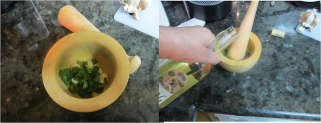 Machacamos el diente de ajo y el perejil en el mortero y cuando este hecho casi papilla le añadimos el vino blanco y removemos con la mano del mortero.