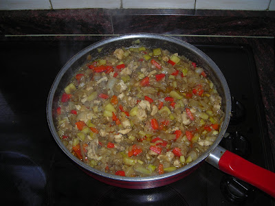 Este plato tiene muchas versiones, depende de lo que tengas en la nevera, muchos ingredientes se acoplan bien. Este por ejemplo tiene pollo, el original tenía carne molida de ternera y arroz.