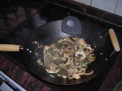 Terminamos de cocinar las setas y champiñones que llevan, sal, perejil, orégano, salsa de soja y un chorrito de coñac. Ya está todo hecho, solo falta decorar, servir y comer.