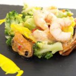 Arroz con pesto de calabacinos, sepia al curry, pasas y aliolì de curry