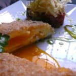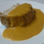 Por otro lado preparamos a fuego lento una emulsión de cilantro (picado muy fino), vino dulce, y soja. Cuando veamos que se torna color rojizo añadimos el lomo manteca a la sartén. Con 5 minutos al fuego haciéndose todo junto es suficiente y dejamos reposar.