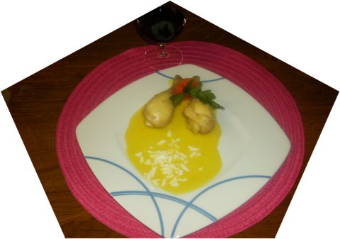 Con un colador y la mano del mortero deshacemos la yema sobre la salsa,  echamos los muslitos de pollo y que de un hervor todo junto..