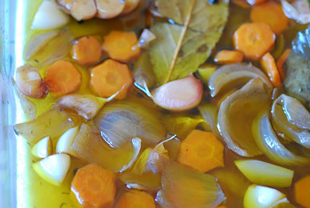 1 cebolla, 2 zanahorias, 1 cabeza de ajo, 1 vaso de vino blanco de buena calidad, 1 vaso de vinagre de Jerez, 1 vaso de aceite de oliva virgen, sal, pimienta negra en grano, 3 ó 4 hojas de laurel, una ramita de tomillo fresco y una pizca de pimentón dulce.