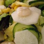 Ensalada fresca con encurtido expréss de rábano y gambas