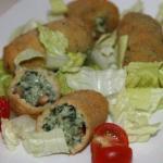 Para el relleno de espinacas empezamos también pochando la cebolla en la sartén y cuando casi esté lista añadimos las espinacas, la manzana, la pera y la calabaza que habremos cocido previamente.Cocinamos unos diez minutos hasta que esté todo tierno y le añadimos la sal y la pimienta al gusto.