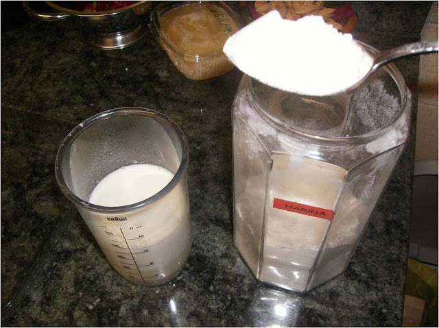 Con el brazo de la batidora batimos un, dos, tres, la leche, harina y azúcar, con esos tres segundos ya no salen grumos.