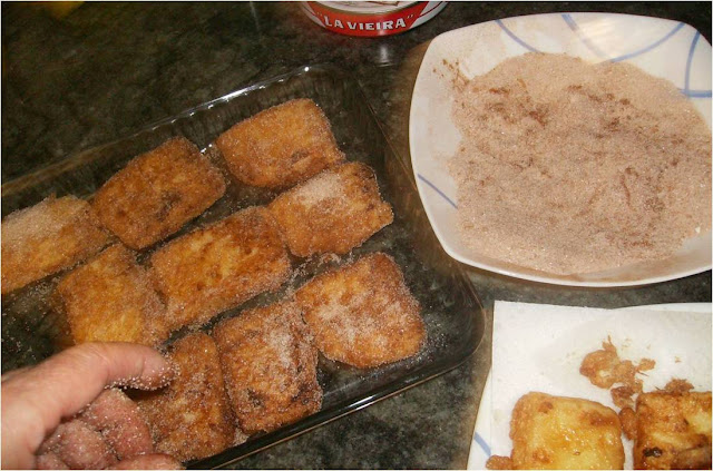En un plato preparamos azúcar y canela, para rebozarla una vez frita.
