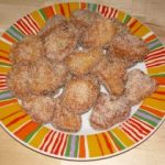 1 litro de leitesal. 1 cullerada de azucre. Canela en rama .Corteza de imón . Ovos. Fariña. Aceite. Canela en pó e azucre