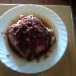 Sacar del horno y poner por encima el jamón picado y el pimiento piquillo picado,