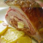 Lomo de cerdo (ibérico) relleno de jamón serrano, queso y huevos.