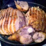 Lomo de cerdo (ibérico) relleno de jamón serrano, queso y huevos.