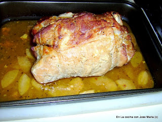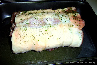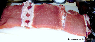 1.- Abrimos la Pieza de Lomo haciendo un corte transversal por la parte de arriba sin llegar a cortarlo, le damos la vuelta con cuidado a la pieza y hacemos otro corte igual al anterior, sólo que a la inversa, ver la fotografía para darnos una idea, extendemos sobre la mesa de trabajo y salpimentamos por las 2 caras.