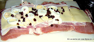 6.- Sobre la manta de lomo, colocamos encima las 6 lonchas de Baicon a las que hemos quitado la corteza, encima de estas ponemos el queso Gouda, sobre el queso colocamos el huevo en rodajas y las pasas, ver fotografía.