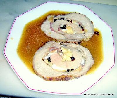 Lomo de cerdo (ibérico) relleno de jamón serrano, queso y huevos.