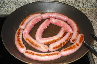 En otra sartén, poner las longanizas a dorar. Pinchar para que suelten grasa.