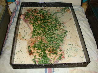 Preparación: lo ideal es dejar el matambre sumergido en 1/2 litro de leche para tiernizarlo. Echar en una asadera para horno el 1/2 litro de leche y encima colocar el matambre estirado. Picar 6 dientes de ajo bien finito y el perejil fresco. Una vez picado, cubrir el matambre con la provenzal y salpimentar a gusto.