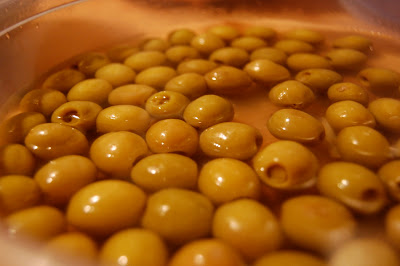 Cortas media cebolla muy pequeña y la agregas. Lo mismo haces con unas 15 aceitunas verdes, medio pimiento rojo, medio pimiento verde y un diente de ajo. Agregas sal.