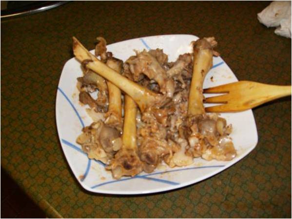 Calentar un poco de aceite en una olla y freír el cordero, para sellarlo un poco, junto con los huesos, quitando los huesos enteros no salen las astillas de los huesos en el guiso, pero los cocemos para que den sabor al guiso.