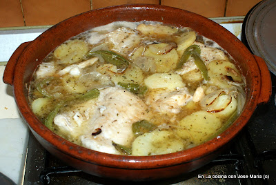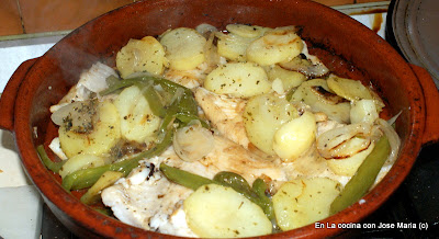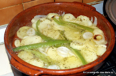 3.- En una cazuela de barro vamos a echar un poco aceite que pondremos a calentar y a continuación sofreiremos las patatas el pimiento y la cebolla siempre teniendo en cuenta los tiempos de los mismos es decir echaremos primero las patatas que son las que más tardan en hacerse, a los 7 minutos las tiras de pimiento y 1 minuto después la cebolla.