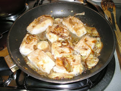 A continuación, poner las tajadas de merluza, una vez saladas (poco, que la soja sala) repartidas por la sartén y dejar a fuego lento, hasta que veáis blanca la merluza, dar la vuelta y mantenerlo unos 2 ó 3 minutos más al fuego, retirar y servir para que esté en su jugo y no quede seco (hoy no lo hice, pero le podéis añadir una gulas o gambas) por aquello de enriquecer, espero que os guste).
