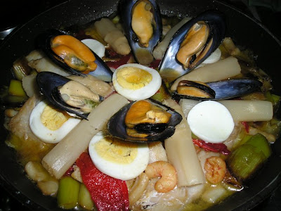 En otra sartén engrasada para que no se pegue, poner la merluza salada y dejar que se haga por una parte e ir sacando a la sartén con el pochado apartado, dejar que coja los sabores mientras se termina de hacer, cuando se entienda que ya está, decorar con el huevo, espárragos y mejillones.