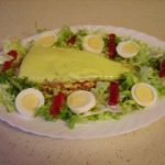 Meter en el horno caliente unos 15 minutos,cuando están casi hechas, poner encima la merluza preparada con las lonchas de jamón y sazonada.