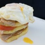 Se coloca en el plato las milhojas de patata y jamón y se corona con un huevo.