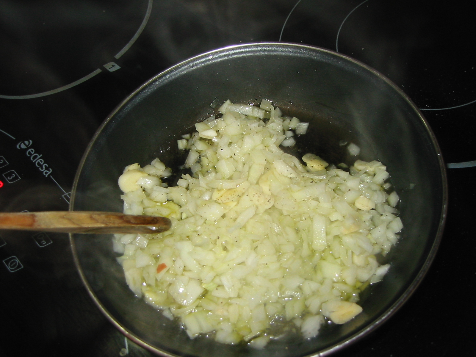 Echamos aceite de oliva en una sarten,echamos la cebolla y los ajos cortados y lo salpimentamos.