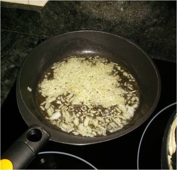 Picamos la cebolla y los dientes de ajos y los freímos con un poco de aceite sin que tome mucho color.