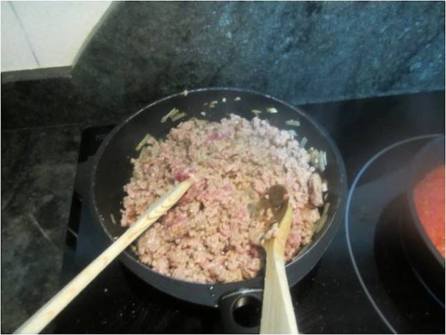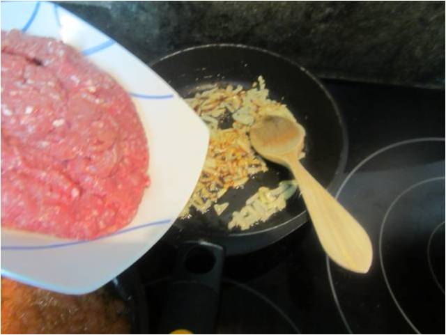 Añadimos a la cebolla la carne picada y dejamos que se fría todo junto a fuego moderado.