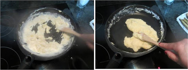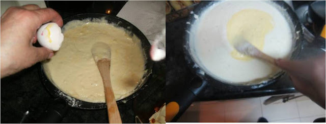 Cuando este bien cocida retiramos del fuego y le añadimos la yema de huevo, moviendo muy rápido para que no cuaje, la yema le da mucha suavidad a la bechamel.
