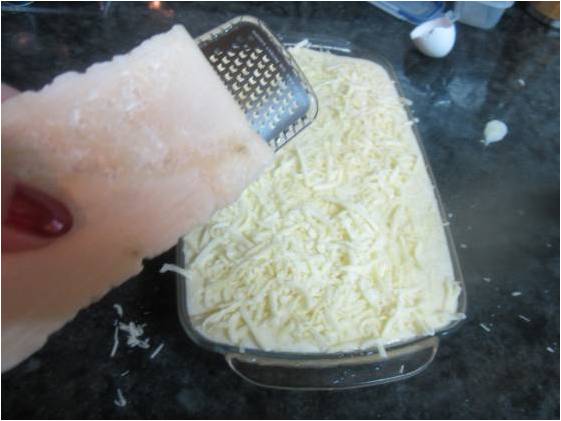 Ponemos una capa de la carne sobre las berenjenas y cubrimos con otra capa de berenjenas así hasta agotar la carne, cubrimos con una buena capa de bechamel, le ponemos el queso mozzarella rallado y le rallamos el parmesano encima también con una buena capa.