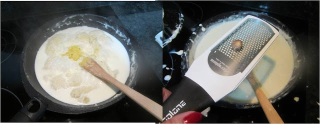 Vamos añadiendo la leche caliente poco a poco y moviendo para que no tenga grumos y nos quede lo mas fina posible, le añadimos las pastilla de caldo concentrado de pollo y un poco de nuez moscada.
