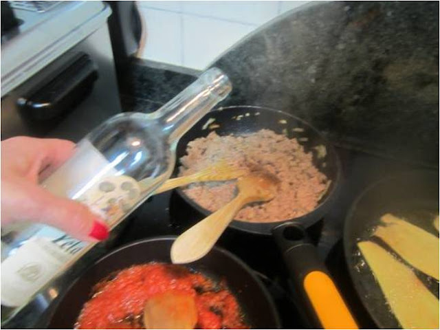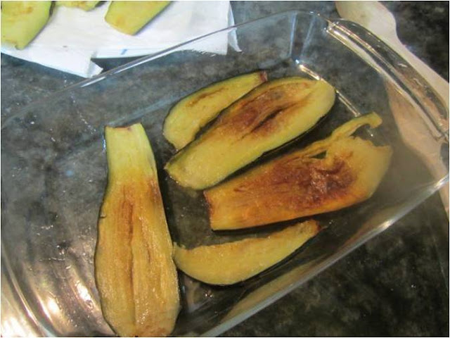 Mientras se nos va cocinando la carne vamos friendo las berenjenas, yo les pongo muy poco aceite porque chupan mucho mas bien se me hacen a la plancha, pero freírlas si harina, y según las saquemos de la sartén las dejamos sobre papel de cocina.