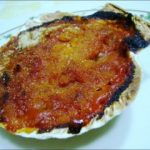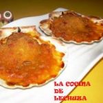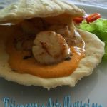 Cada hoja de masa filo la doblamos en cuatro partes y hacemos una especie de cuencos con las manos, si disponemos de conchas vacias de vieiras, excelente, nos vale. /yo lo he horneado ahí/. Horneamos 10 minutos aproximadamente a 180º. Dejamos enfriar. Mientras tanto picamos el surimi muy pequeñito y reservamos.