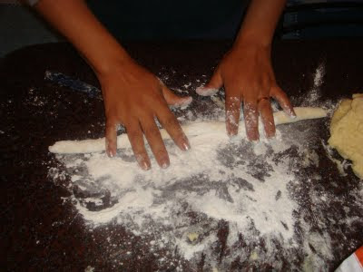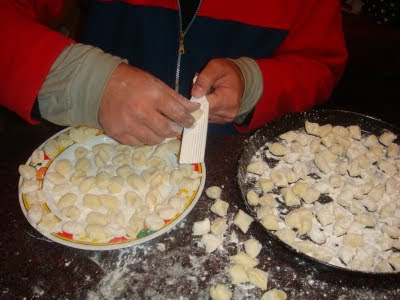 Cortar en daditos de 1 cm x 1 cm y pasarlos por una ñoquera o tenedor para hacer el rulito típico.