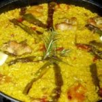 Ponemos tiritas de pimiento y proseguimos cocción por 15 min. a fuego suave pero que llegue a toda la paellera. Apartamos, tapamos con papel y dejamos reposar 10 min.