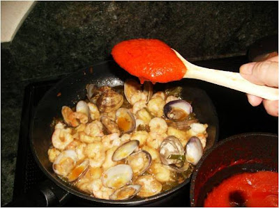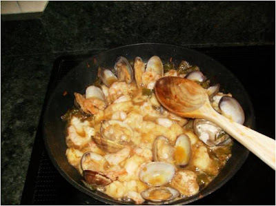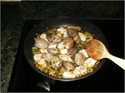 Le añadimos las almejas y dejamos que se abran moviéndolas con la cuchara.