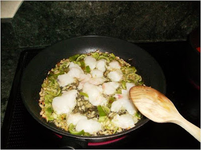 En una sartén, freímos cebolla y pimiento verde, cuando tome un poco de color le añadimos rape en trozos pequeños y lo rehogamos.