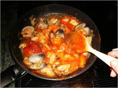 Le añadimos los calamares y las gambas peladas y rehogamos.