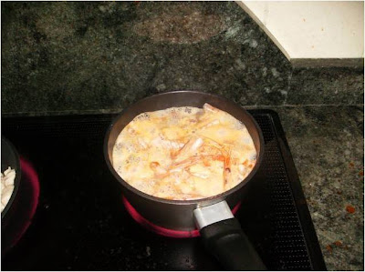 En un cazo ponemos una cucharada de agua y abrimos los mejillones tapando, para que se habrán al vapor y una vez abiertos los sacamos añadimos un poco más de agua y echamos las cascaras con las cabezas de las gambas para hacer un fumé.