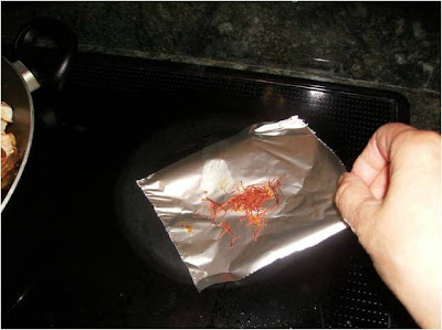 A mí me gusta tostar un poquito el azafrán pero hay que tener mucho cuidado porque se quema enseguida, lo tuesto sobre papel de aluminio.
