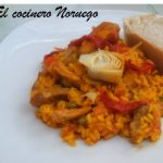 Rehogar en la paellera con una cucharada de aceite de oliva virgen extra, el ajo y la cebolla picada. Añadimos también el tomate en cuadraditos y el pimiento rojo.