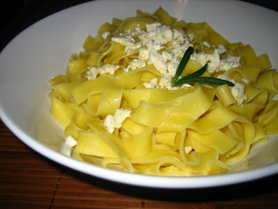 Poner el gua a hervir y añadir unas hojitas de romero, dejar que hiervan 10 minutos y añadir la pasta, salar. Dejar que hierva según os guste más o menos «al dente». Escurrir, añadir un chorrito de AOVE en crudo (importante que sea de buena calidad, a mí me gusta mucho el arbequina), desmigar un poco de queso feta y añadirlo por encima.