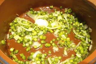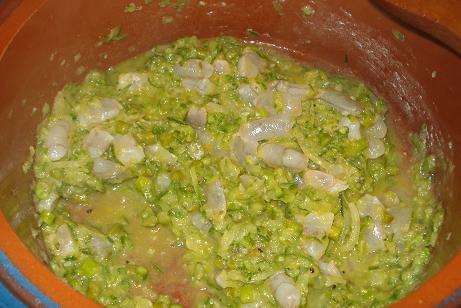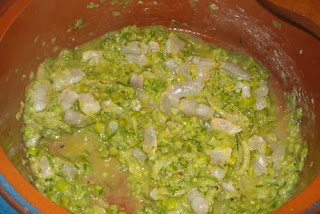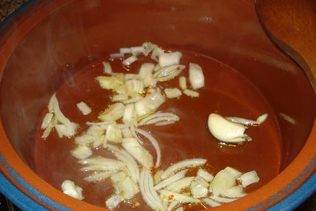 En una cazuela de barro, poner 4 cucharadas de aceite, la cebolla picada, un poco de guindilla y el diente de ajo entero (luego se retira).